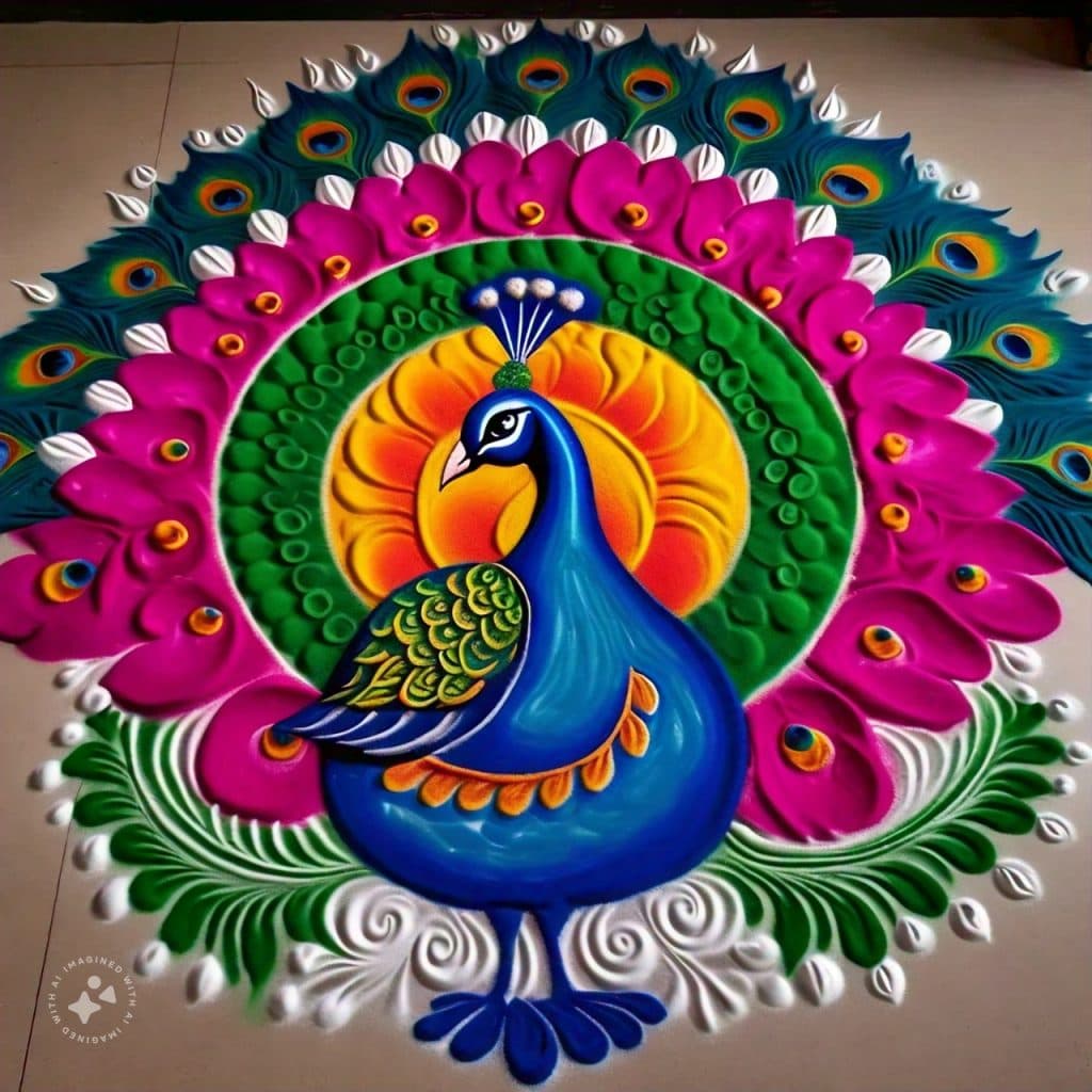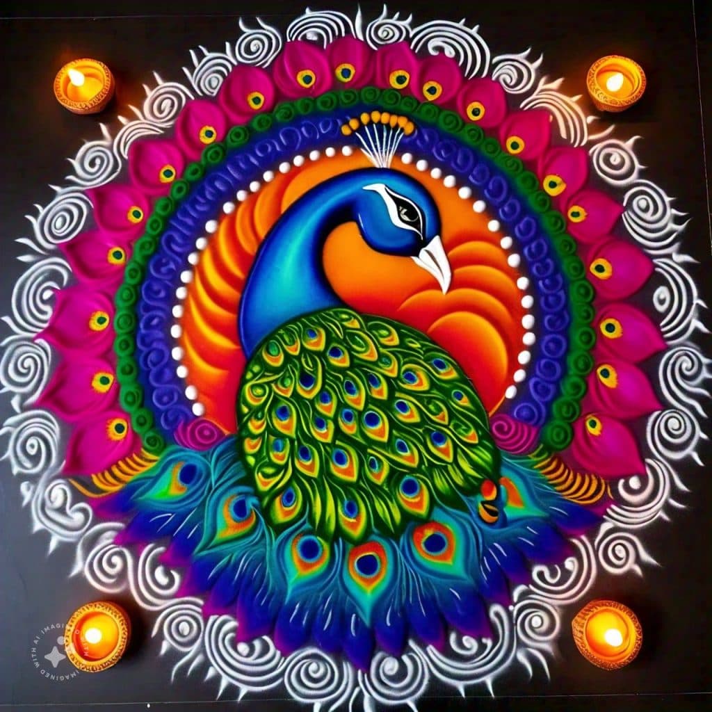मोर डिजाइन की रंगोली कई सालों से दिवाली पर बनाई जा रही है. इस रंगोली डिजाइन की लोकप्रियता बहुत अधिक है, ऐसा इसलिए भी है क्योंकि इसकी खूबसूरती बहुत अधिक होती है और इसकी भव्यता देखने लायक होती है.
