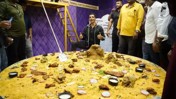 इन फोटो में आप देख सकते हैं कि सोनू सूद एक बहुत बड़ी बिरयानी से भरी थाली के पास खड़े होकर पोज देते हुए दिखाई दे रहे हैं. सोनू सूद ने इन तस्वीरों के कैप्शन में लिखा है कि- भारत की सबसे बड़ी खाने की थाली का नाम अब मेरे नाम सोनू सूद पर रखा गया है. एक शाकाहारी व्यक्ति जो बहुत कम खाना खाता है, उसके नाम पर 20 लोगों की खाने की थाली कैसे हो सकती है.