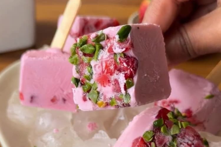 - अब आइसक्रीम मोल्ड को लें. इसमें थोड़े-थोड़े छोटे कटे हुए स्ट्रॉबेरी के पीस डाल दें. इसके बाद आप बारीक कटा हुआ पिस्ता भी थोड़ा थोड़ा डाल दें. तैयार मिश्रण को इसमें डालें. बीच में आइसक्रीम स्टिक डालें और इसे रातभर के लिए फ्रीजर में रख दें. जब ये अच्छे से जम जाए तब इसे आप सर्व करें. इस तरह से आप घर पर ही हेल्दी आइसक्रीम बना सकते हैं.