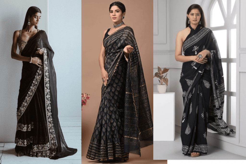 1. ब्लैक प्रिंटेड वर्क साड़ी (Black Printed Work Saree)