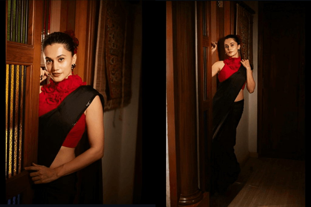 जो लोग स्टेटमेंट बनाना पसंद करते हैं, उनके लिए तापसी का ब्लैक साड़ी लुक ज़रूर देखना चाहिए. अभिनेत्री ने आधुनिक ट्विस्ट के साथ एक स्लीक, प्लेन ब्लैक साड़ी पहनी है – जटिल डिटेलिंग के साथ एक बोल्ड, बैकलेस ब्लाउज़.
