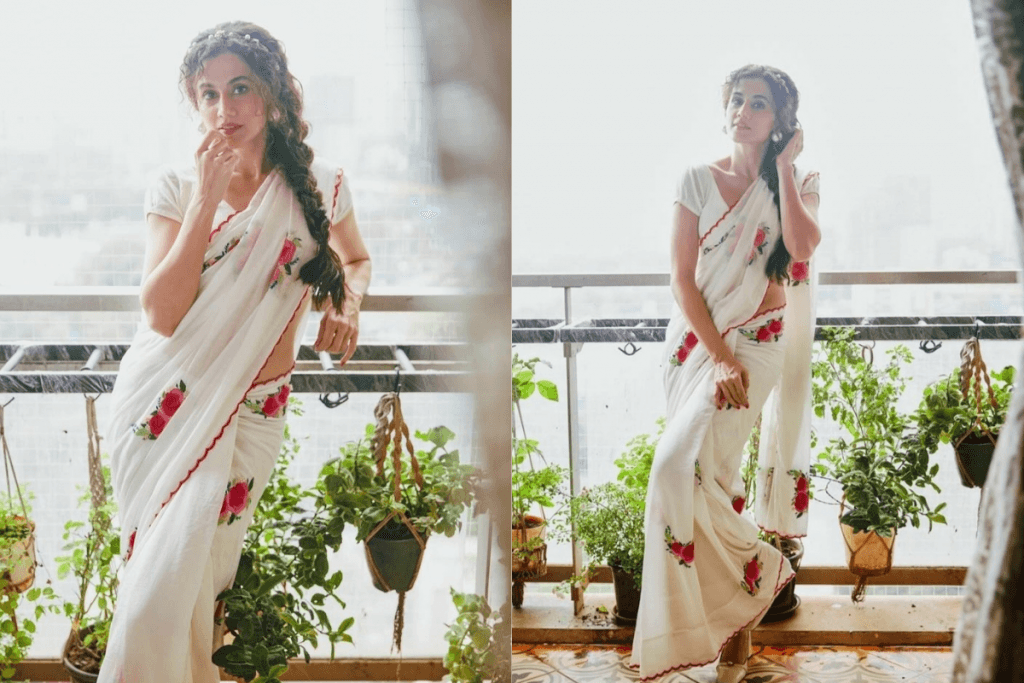 अपने सबसे आधुनिक लुक में से एक में, तापसी ने हल्के पेस्टल ऑर्गेना साड़ी में कमाल की चमक बिखेरी है. पारदर्शी कपड़ा समकालीन स्वभाव का स्पर्श जोड़ता है, जबकि सीमाओं के साथ नाजुक फूलों की कढ़ाई साड़ी के स्त्री आकर्षण को बढ़ाती है.