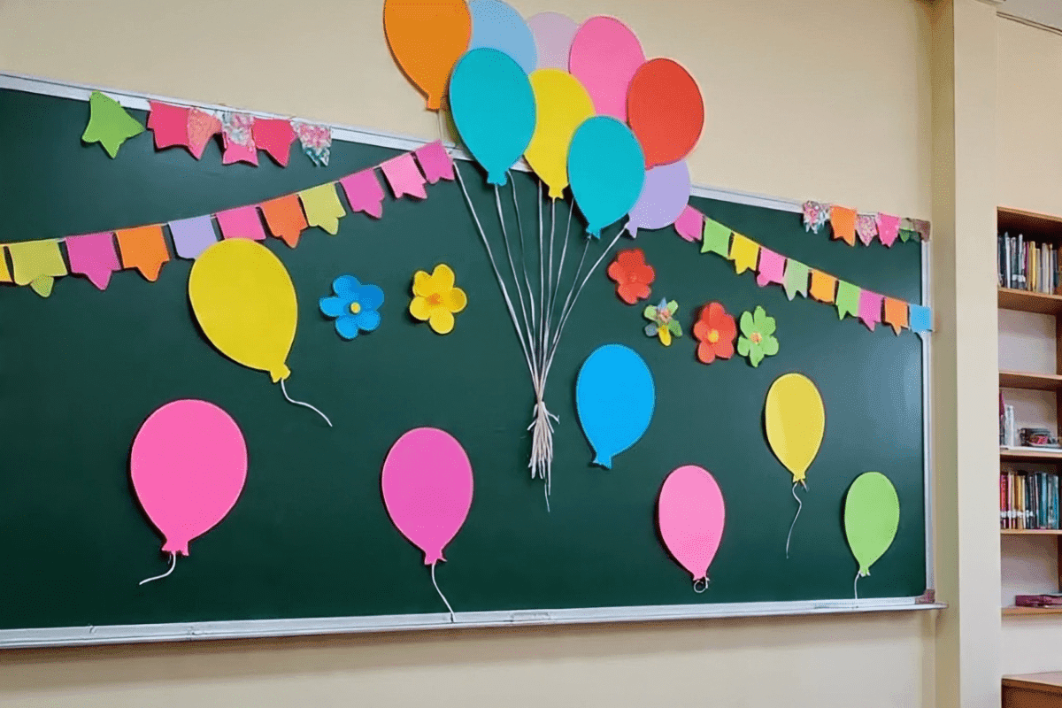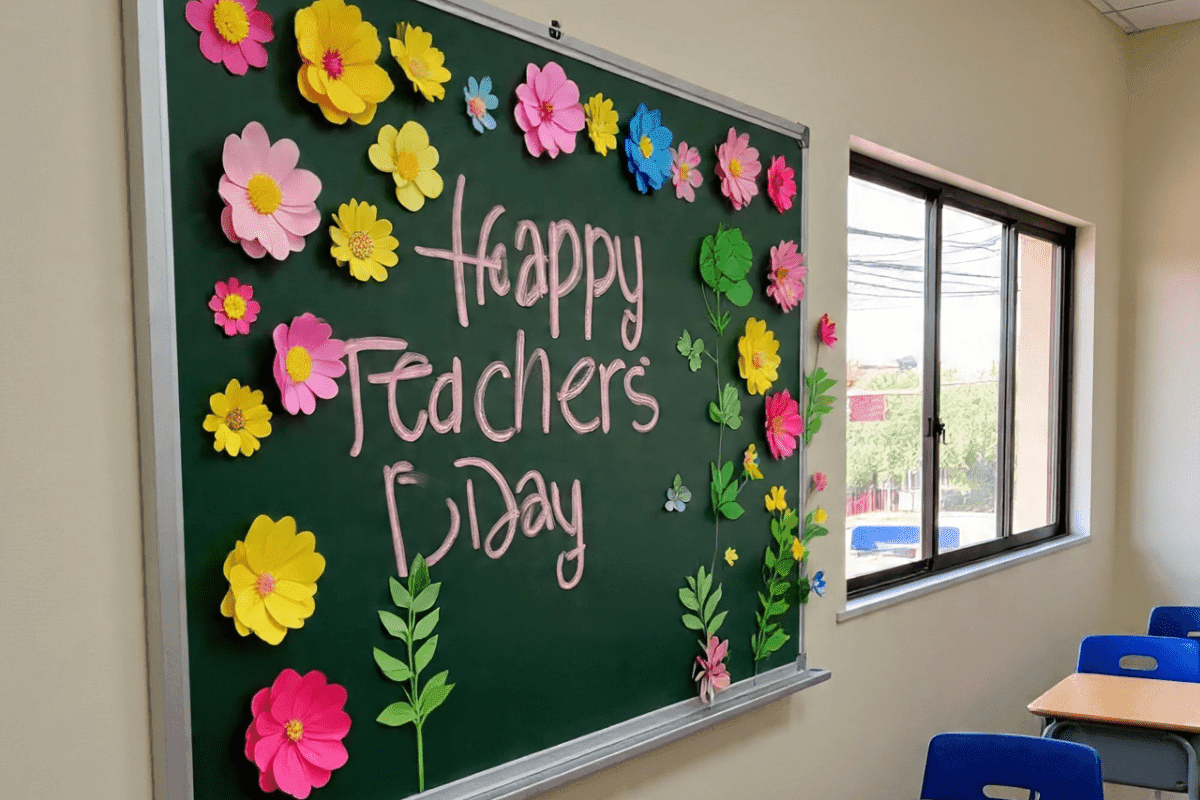 ब्लैकबोर्ड पर आकर्षक डिजाइन बनाने के लिए रंग-बिरंगे क्रेयॉन और चॉक का इस्तेमाल करें. आप फूल, हार्ट, और सितारों के छोटे-छोटे पैटर्न बना सकते हैं. इसके साथ “हैप्पी टीचर्स डे” जैसे संदेश लिखें. यह सजावट बहुत ही खूबसूरत दिखती है.