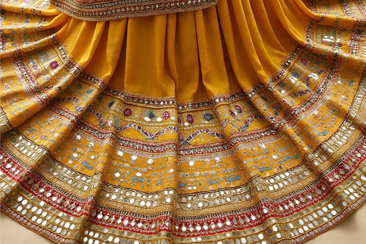 मिरर वर्क लहंगा: छोटे-मोटे मिरर वर्क से सजाए गए लहंगा इस तीज में बहुत ट्रेंड कर रहे हैं. यह डिजाइन पार्टी और पारंपरिक दोनों मौके के लिए परफेक्ट है.