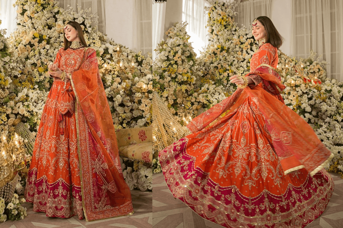 1. Top 10 Hania Amir Lehenga Looks | Hania Amir Orange and Black Ghera Lehenga Look: ऑरेंज और ब्लैक घेरा लहंगा लुक