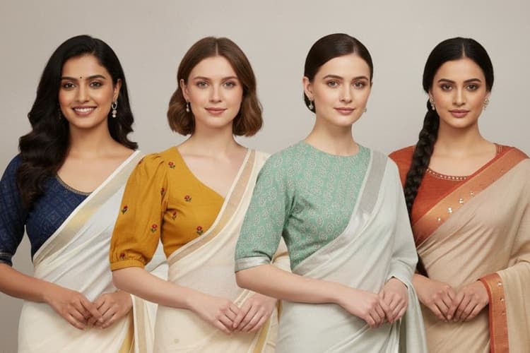 प्लेन राउंड नेक ब्लाउज ऑफिस वियर के लिए सबसे सुरक्षित और क्लासिक ऑप्शन माना जाता है. यह कॉटन और लिनन साड़ियों के साथ बेहद सुंदर लगता है और दिनभर पहनने में आरामदायक रहता है.