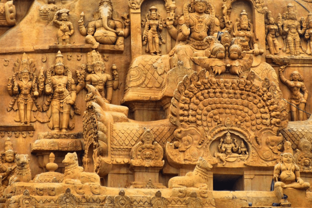 जटिल नक्काशी और मूर्तियां विभिन्न पौराणिक कहानियों और देवताओं को दर्शाती हैं, जो कारीगरों के असाधारण कौशल को दर्शाती हैं.
