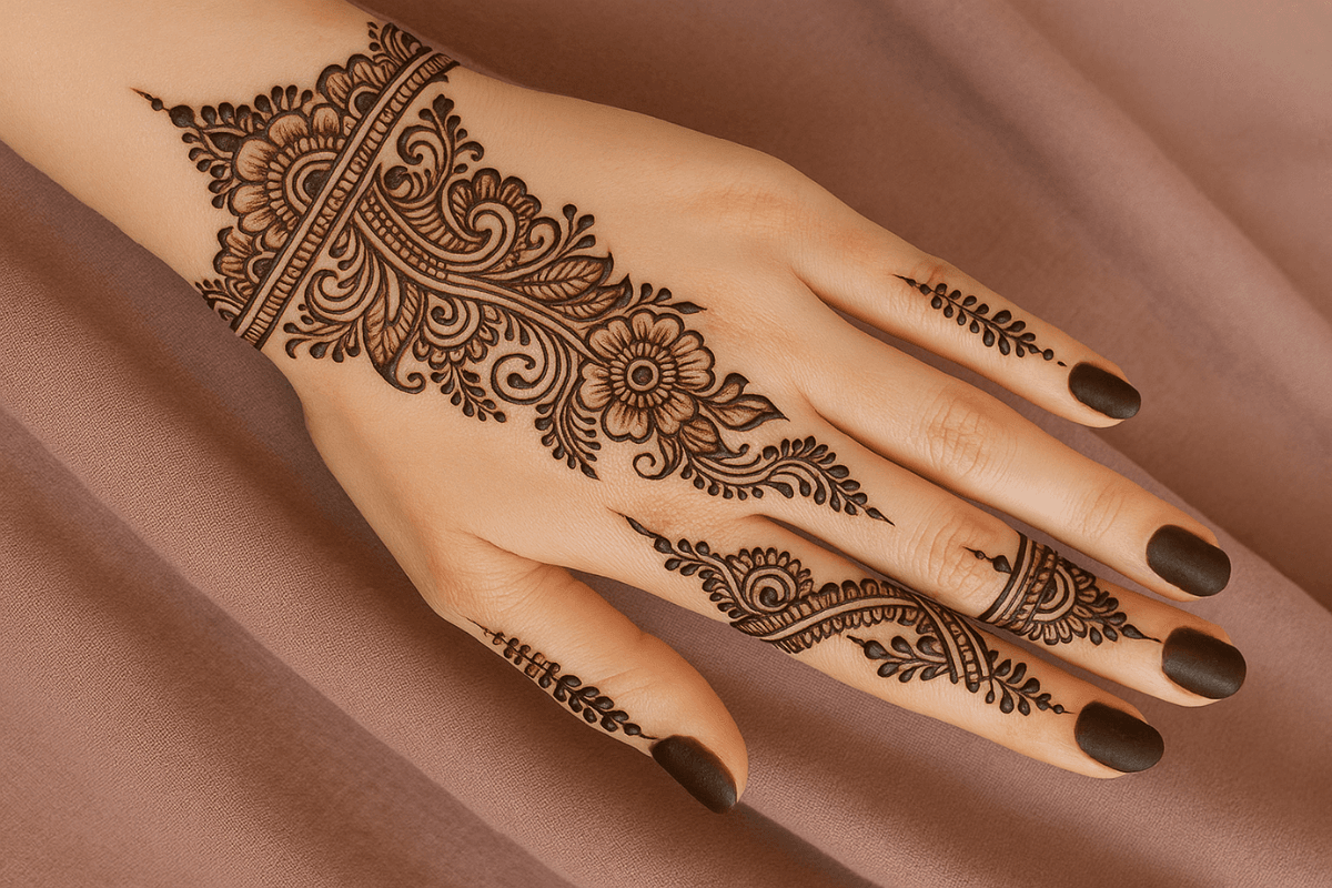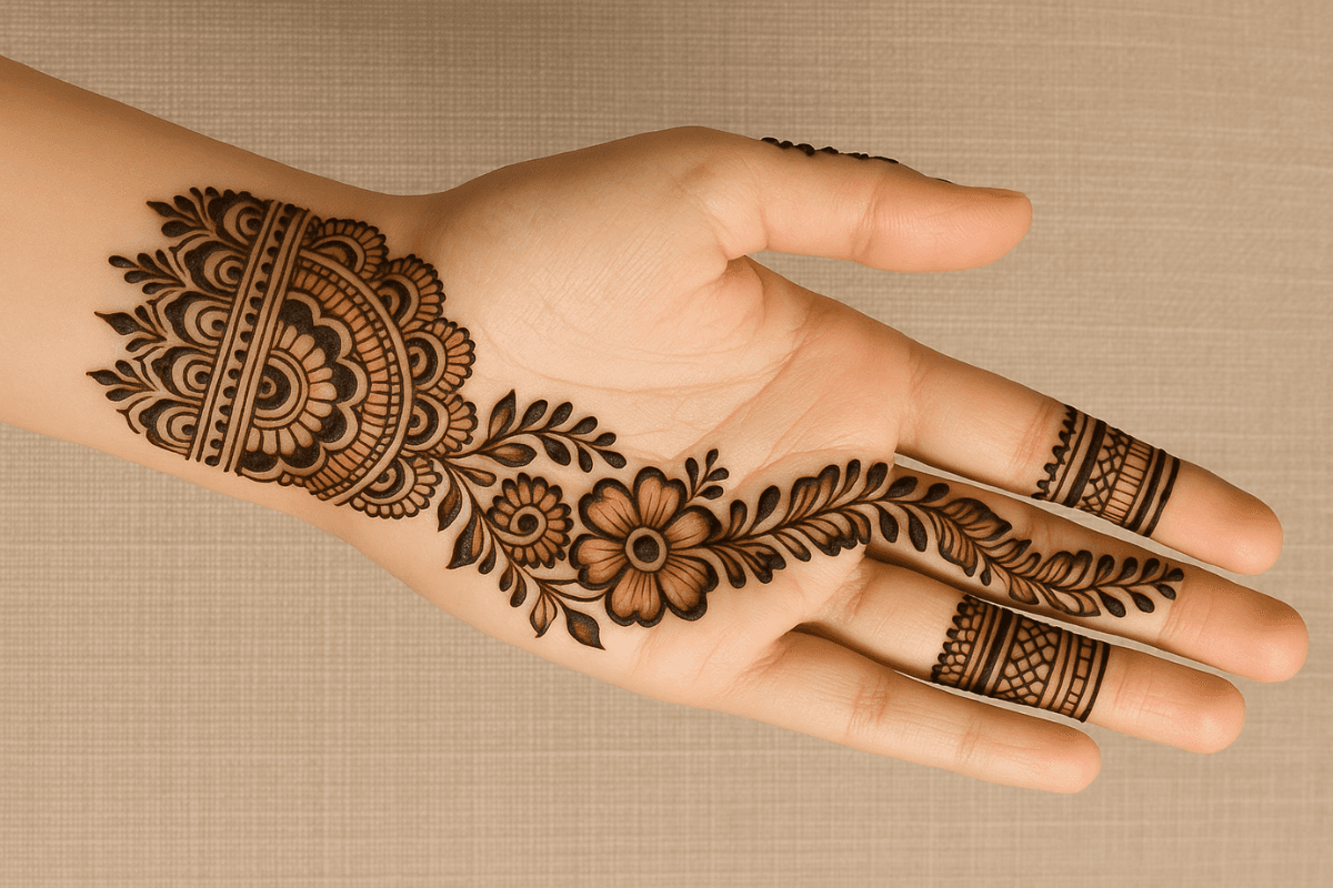 फूलों और बेलों से बना यह मेहंदी डिजाइन बेहद सुंदर और नेचुरल लुक देता है. इसमें हर पैटर्न को बहुत ही प्यार से सजाया गया है. यह हर फेस्टिवल और फंक्शन में आपके हाथों को खास बना देगा.