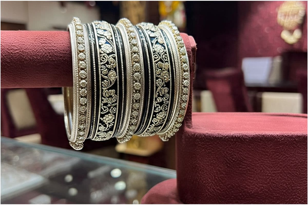 ऑक्सीडाइज़्ड सिल्वर चूड़ियां जो आपको पारंपरिक लुक देती हैं.एथनिक वेयर जैसे साड़ी, सूट या लहंगे के साथ बेहद खूबसूरत लगती हैं. लड़कियां इन्हें कॉलेज या फेस्टिव फंक्शन में पहनना पसंद करती हैं.