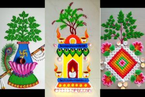 तुलसी के वृंदावन के जैसे रंगोली डिजाइन – चौरा के चारों ओर फूलों और दीयों से बनी सिंपल रंगोली में सफेद और पीले रंग का ज्यादा प्रयोग करें, जिससे यह पारंपरिक लगे. राधा कृष्ण के बंधन वाली रंगोली सभी को बेहद पसंद आएगी.
