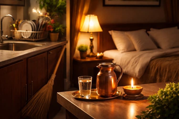 वास्तु मान्यताओं के अनुसार रात को सोते समय सिरहाने के पास पानी से भरा ग्लास या फिर तांबे को लोटा रखना काफी ज्यादा फायदेमंद साबित होता है. मान्यताओं के अनुसार जब आप ऐसा करते हैं, तो सिरहाने के पास रखा पानी सारे निगेटिव एनर्जी को अपने अंदर खींच लेता है. इसके अलावा आपको इस बात का भी ख्याल रखना है कि अगली सुबह इस पानी को पौधों में डाल दें.