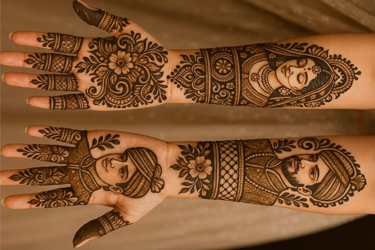 दूल्हा-दुल्हन मेहंदी डिजाइन आज की मेहंदी कला में सबसे खास डिजाइनों में से एक मानी जाती हैं. इसे आप वट सावित्री के खास दिन में अपने हाथों में रचा सकते हैं. (Trending Mehndi Design)