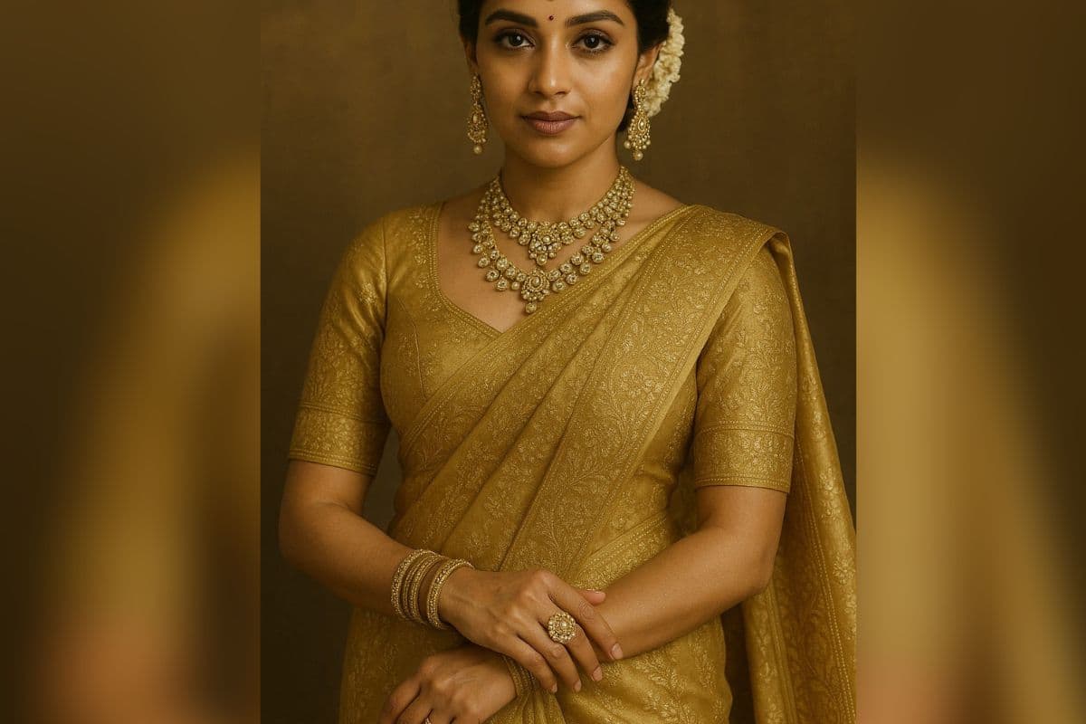 बनारसी साड़ी एक एवरग्रीन ऑप्शन है और ये आपके लुक को और बढ़ा देता है. बनारसी साड़ी का बारीक काम एक अट्रैक्टिव लुक देता है. आप इसके साथ गोल्डन गहने को पहन सकती हैं.