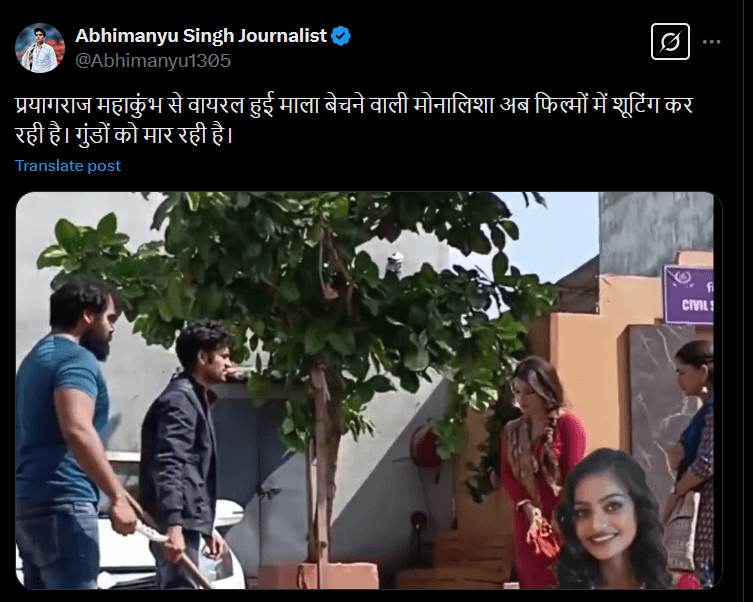 दरअसल, सोशल मीडिया प्लेटफॉर्म X पर @Abhimanyu1305 नामक एक अकाउंट से एक वीडियो अपलोड किया गया है, जिसमें एक लड़की कई गुंडों के साथ एक्शन सीन करते हुए दिखाई दे रही है. दावा किया जा रहा है कि एक्शन सीन कर रही लड़की मोनालिसा है. हालांकि, यह स्पष्ट तौर पर नहीं कहा जा सकता है कि ये लड़की कुंभ में रुद्राक्ष बेचने आई मोनालिसा ही है. इस वीडियो को देखकर यूजर्स की अलग-अलग प्रतिक्रियाएं सामने आ रही हैं. इस वीडियो को पोस्ट करते हुए @Abhimanyu1305 लिखते हैं कि प्रयागराज महाकुंभ से वायरल हुई माला बेचने वाली मोनालिशा अब फिल्मों में शूटिंग कर रही है. गुंडों को मार रही है.