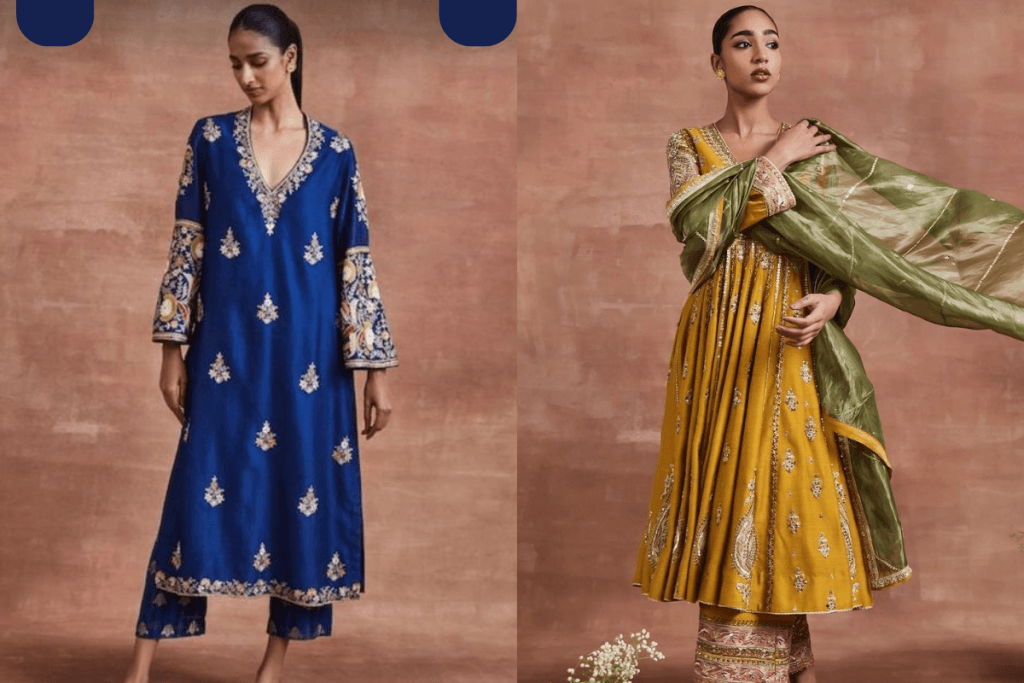 लॉन्ग कुर्ता और शरारा का कॉम्बिनेशन इस बार शादी के सीजन में खूब पसंद किया जा रहा है. लॉन्ग कुर्ता पर की गई बारीक कढ़ाई और शरारा की भारी कढ़ाई इसे खास बनाती है. इसे शादी या रिसेप्शन जैसे अवसरों पर पहना जा सकता है. इसके साथ मैचिंग दुपट्टा लुक को और अधिक ग्रेसफुल बनाता है.