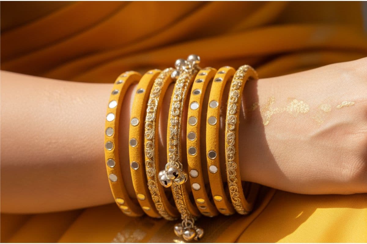 मखमली पीली चूड़ियां और कौड़ियों का संगम (Yellow Velvet with Cowrie Shells):पीली मखमल की चूड़ियों के साथ सफेद कौड़ियों वाले कंगन देखने में बेहद ही खूबसूरत लगते हैं.इसे आप साड़ी और सूट दोनों के साथ पहन सकती हैं.