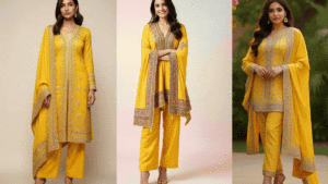 स्ट्रेट कट येलो सूट आजकल काफी ट्रेंड में है. यह लुक को मॉडर्न और क्लासी बनाता है. मिनिमल मेकअप और हल्के गहनों के साथ यह बहुत सुंदर लगता है. पूजा के मौके पर यह सूट सादगी और स्टाइल दोनों दिखाता है.
