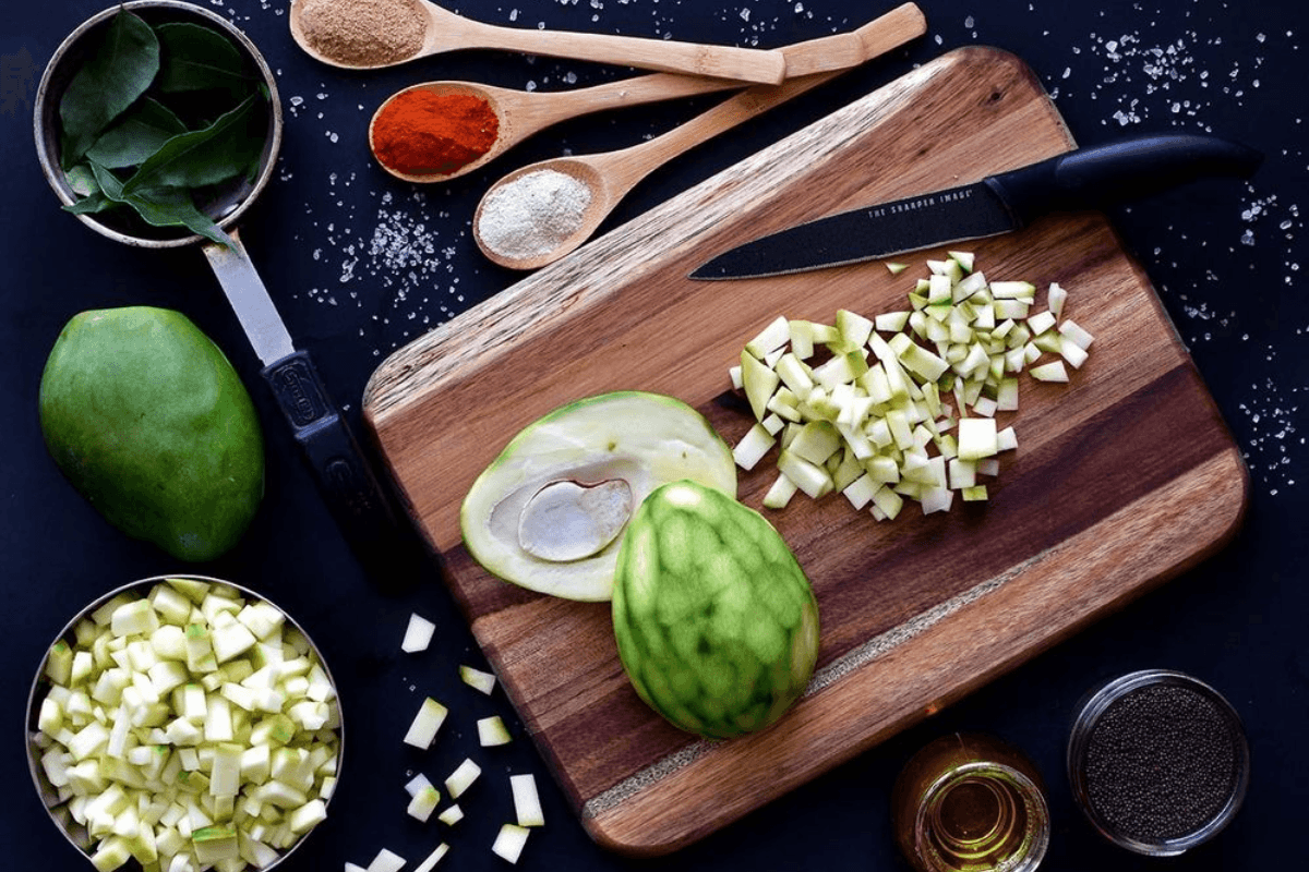- सबसे पहले कच्चे आम को अच्छे से धोकर छोटे-छोटे टुकड़ों में काट लें.