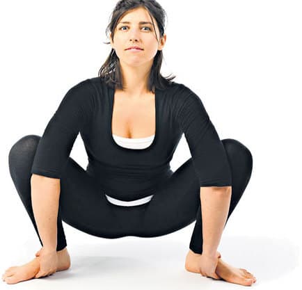 अभ्यास की विधि : दोनों पैरों के बीच लगभग दो फुट की दूरी रखते हुए उकड़ूं बैठे. दोनों हाथों की उंगलियों को तलवों के नीचे और अंगूठों को ऊपर रखते हुए पंजों को अंदर की तरफ से पकड़कर कोहनियों को थोड़ा सा मोड़कर भुजाओं के ऊपरी भाग से घुटनों के भीतरी भाग पर दबाव डालें. अभ्यास के दौरान आंखें खुली रहेगी. सिर को पीछे ले जाते हुए श्वास अंदर की तरफ ले.