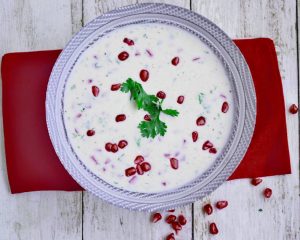 डेढ़ कप ठंडी दही, तीन चौथाई चम्मच अनार के दाने, आधा चम्मच भुने जीरे का पाउडर, एक चौथाई चम्मच काली मिर्च पाउडर, चुटकी भर लाल मिर्च पाउडर, एक चौथाई चम्मच चाट मसाला, चुटकी भर काला या सेंधा नमक, हरी धनिया या पुदीने की पत्ती बारीक कटी हुई.