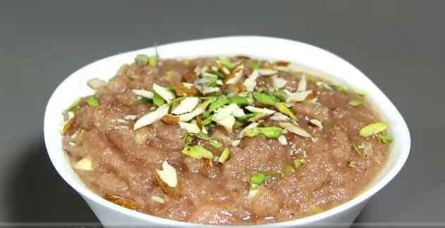 आपका हलवा तैयार हो गया है अब इसके ऊपर 1-2 चम्मच घी और बादाम पिस्ते डालकर सजा दें और आनंद लें स्ट्राबेरी हलवे का.