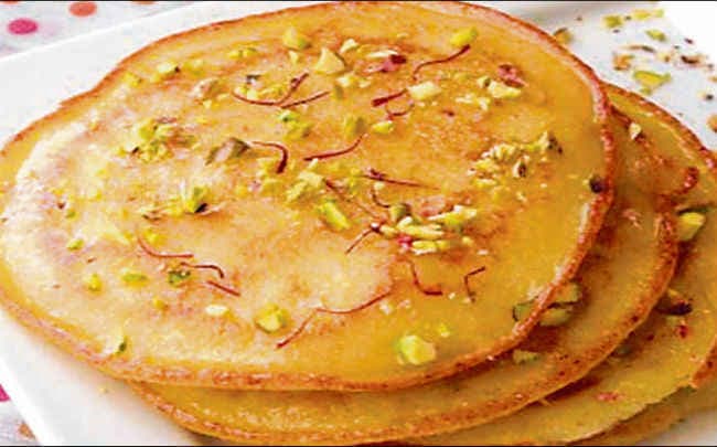 अब एक सपाट नॉन स्टिक तवा या पैन गरम करे उसमे घी डालें और एक बड़ा चम्मच भर के बटर डालें. धीमी आंच पर पकने दें. जब पुए के किनारे सुनहरे होने लगें, तो उसे पलट के दूसरी तरफ से भी सेक लें. दोनों तरफ से सिकने के बाद उसे चाशनी में डाल दें. कुछ देर चाशनी में पड़ा रहने दें. फिर निकाल कर पिस्ता और बादाम से सजा कर मेहमानों को परोसें.
