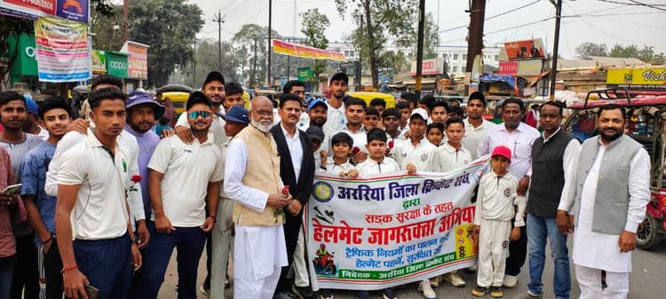 -24- प्रतिनिधि, अररिया अररिया जिला क्रिकेट संघ द्वारा शुक्रवार की दोपहर साढ़े 03 बजे से सड़क सुरक्षा अभियान के तहत जिले के किक्रेट खिलाड़ियों द्वारा दो पहिया वाहन चालक को जागरूक करने के लिए चांदनी चौक पर गुलाब का फूल देकर अभियान की शुरुआत की गयी. साथ ही लोगों से अपील की गई कि आप जब भी घर से दो पहिया वाहन से बाहर निकले तो हेलमेट जरूर पहनें. आपका जीवन आपके परिवार के लिए अनमोल है. अररिया जिला क्रिकेट संघ के खिलाड़ी रहे दिवगंत अमन सिंह राजपूत व अमन मिश्रा का विगत दिनों सड़क दुघर्टना में मौत हो गयी. उक्त दुर्घटना को देखकर अररिया जिला क्रिकेट संघ के सदस्यों ने आमजनों के बीच पहुंचकर उन्हें जागरूक करने के लिए पुष्पगुच्छ देकर यह अपील की है. मौके पर बिहार क्रिकेट संघ जिला प्रतिनिधि ओम प्रकाश जायसवाल, जिला क्रिकेट संघ के अध्यक्ष प्रवीर कुमार विश्वास, उपाध्यक्ष चांद आजमी, सचिव सुनील कुमार, संयुक्त सचिव अनामी शंकर, कोषाध्यक्ष अमित सेनगुप्ता, वरीय सदस्य सत्येन नाथ शरण, परवेज आलम, दिलीप झा, रविशंकर दास, तनवीर आलम, खिलाड़ी उज्जवल कुमार, राजा बाबू, अशफाक, सरवन कुमार, आदित्य राज, नवनीत, किशलय, आदर्श सिन्हा व उत्तम कुमार सहित अन्य मौजूद थे.
