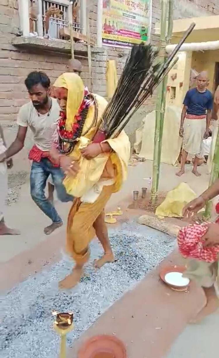 रजौन. पूजा पद्धति में विश्वास करने वाले लोग आज भी कुछ ऐसी पुरानी मान्यताओं को लेकर चल रहे हैं जिस पर आज भी कुछ विशेष समाज के लोग आस्था रखते हैं. वहीं कुछ लोग इसे आडंबर व अंधविश्वास कहते हैं. इसी में है एक राहु पूजा, जिसमें कुछ लोग अंगारों पर नंगे पांव चलकर मनचाही मुराद पूरी होने की कामना करते हैं. ऐसा ही कुछ सोमवार को बाबरचक गांव में देखने को मिला. नवादा खरौनी ग्राम पंचायत के बाबरचक गांव में रजौन मध्य जिला परिषद सदस्य सुमन पासवान के घर सोमवार को आयोजित राहु पूजा के दौरान लोग लकड़ी जलाकर अलसुबह से स्नान कर अंगारों पर नंगे पांव चलकर पार हो रहे थे, लेकिन आस्था के आगे उनको कुछ भी नहीं हो रहा था. पुजारी सोनू भगत ने बताया कि इस पूजा का आयोजन सुख, शांति व समृद्धि के लिए कराया जाता है. जो शादी-विवाह या अन्य शुभ अवसरों पर होते हैं. यह पूजा कठिन पद्धति की है. जिसे मानने वालों को निर्जला व्रत रहकर पूरी रात भजन-कीर्तन कर जागरण करना पड़ता है. इसके बाद साढ़े पांच हाथ नापकर लंबा व एक फीट गहरा का गड्ढा खोदा जाता है. जिसमें कच्चे बेल की लकड़ी डालकर उसकी आग तैयार की जाती है और अलसुबह ही स्नान कर विधि के अनुरूप लोग उस जलते अंगारों पर नंगे पांव एक बार ही नहीं कई बार चलकर पार होते है. ऐसा करने से उनकी मान्यता पूरी हो जाती है.