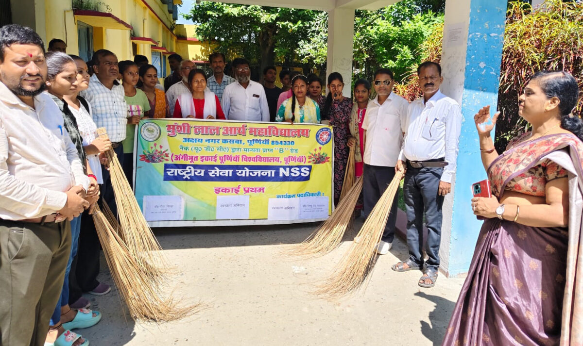 कसबा. स्थानीय मुंशी लाल आर्य महाविद्यालय के प्रांगण में शुक्रवार को प्रधानाचार्य डॉ. रीता सिन्हा की अध्यक्षता में और एनएसएस कार्यक्रम पदाधिकारी डॉ विष्णुदेव पासवान के नेतृत्व में स्वच्छता पखवारा के अंतर्गत स्वच्छता अभियान का शुभारंभ किया गया. इस दौरान महाविद्यालय के छात्र-छात्राएं, शिक्षक एवं शिक्षकेतर एवं अन्य कर्मियों ने भाग लिया. मौके पर मौजूद छात्र एवं छात्राओं सहित महाविद्यालय के कर्मियों ने अपने हाथों में झाड़ू लेकर महाविद्यालय के प्रांगण और उसके आसपास साफ-सफाई की . मौके पर प्रधानाचार्य डॉ रीता सिन्हा ने कहा कि स्वच्छता मानव जीवन का एक महत्वपूर्ण पहलू है. स्वच्छता से तन और मन दोनों स्वस्थ रहता है. एनएसएस पदाधिकारी डॉ विष्णुदेव पासवान ने कहा कि सभी को अगर स्वस्थ रहना है तो स्वच्छता अपनाएं.