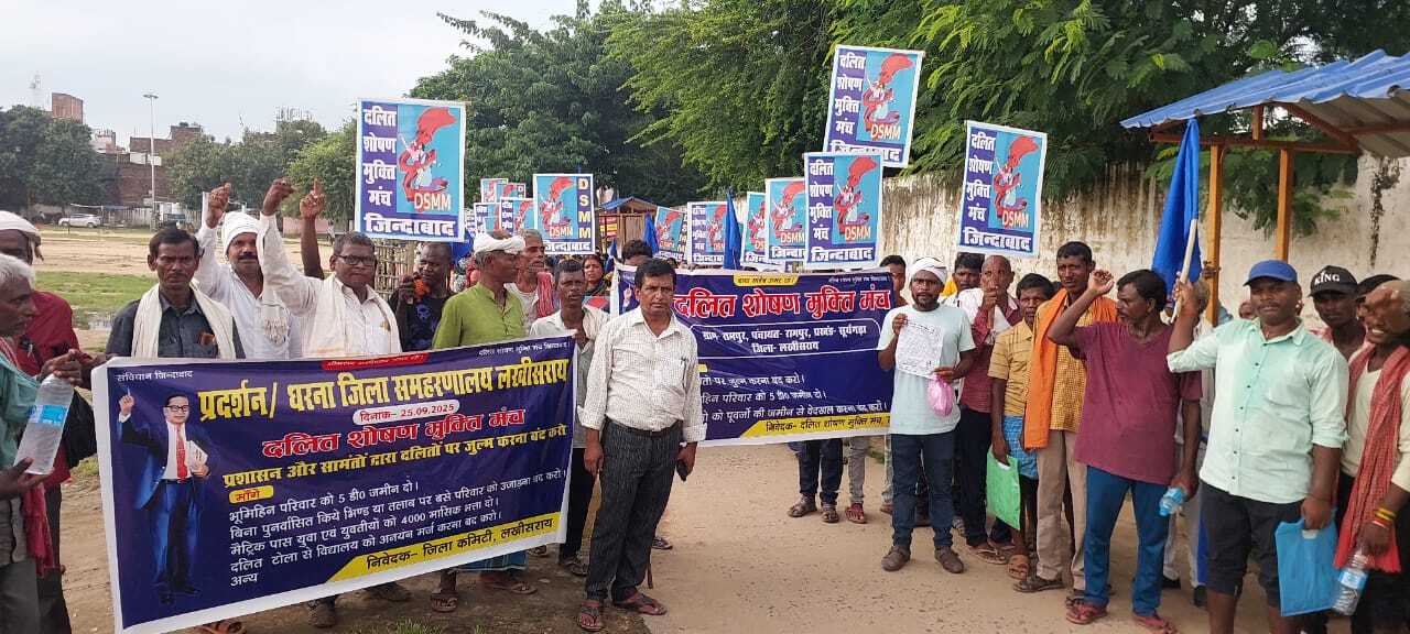 लखीसराय. दलित मुक्ति मंच जिला संयोजन कमेटी के तत्वावधान तथा संरक्षक रंजीत कुमार अजीत के नेतृत्व में संगठन से जुड़े लोगों ने गुरुवार को केआरके मैदान से प्रदर्शन प्रारंभ कर जिला समाहरणालय स्थित धरना स्थल पर एक दिवसीय धरना दिया. जिलाधिकारी को मांगपत्र सौंपकर सरकार द्वारा घोषित दलित भूमिहीनों को पांच डिसमिल जमीन देने की बात की गयी, लेकिन जिले के अंदर आज तक पूर्ण रूपेण न तो भूमिहीनों को जमीन आवंटित किया गया है, जो भूमि दिया गया उसे सही ढंग से प्लॉटिंग नहीं करके दिया गया है. परिणामस्वरूप आपस में विवाद होने की संभावना बनी रहती है. दलित लोगों ने सीओ को कई बार मापी कर अलग करने की मांग की, लेकिन वे नहीं सून रहे हैं. सामंतियों द्वारा पर्चा जमीन को भी मंदिर के नाम पर घेरा जा रहा है़ कहीं वन विभाग द्वारा धौंस दिखाकर दलित व आदिवासी को धमकाया जा रहा है़ हटाने की बात किया जा रही है. दलित के बस्ती में आज भी रोड नाली व पानी की व्यवस्था समुचित रूप से नहीं है. नगर परिषद क्षेत्र वार्ड एक में कानूनिया डीह टोला दलित बस्ती में रोड की व्यवस्था नहीं है. जो भी दलित बस्ती में विद्यालय है उसे भी मर्ज के नाम पर हटाया जा रहा है. आज जो शिक्षा की बाजारीकरण किया जा रहा है, उसके तहत प्राइवेट विद्यालयों में दलितों के बच्चों को 25 प्रतिशत आरक्षण सरकार द्वारा दी गयी है, लेकिन प्राइवेट विद्यालयों की ऊंची ऊंची दामों का किताब व कॉपी व प्रत्येक साल किताब को अलग-अलग चलने की प्रक्रिया के कारण ऊंचे दामों के चलते दलित बच्चों की शिक्षा वंचित रह जाते है. इसके अलावा कई मांग शामिल है. मौके पर जिला संरक्षक रंजीत कुमार अजीत, जिला संयोजक महेश मांझी, सह संयोजक रामपाल मांझी, संरक्षक अधिवक्ता मनोज कुमार मेहता, बनो मांझी, प्रमोद दास, सुधीर पासवान, कुंदन माझी, प्रह्राद मांझी, गुरुदेव मांझी, लखन मांझी, राजू मांझी, मिथिलेश मांझी, कुंती कुमारी, अनिक मांझी एवं जिला के वरिष्ठ नेता मोती साह सैकड़ों की संख्या में उपस्थित लोग शामिल हुए.