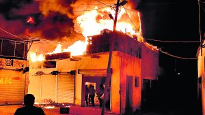 रांची. अरगोड़ा थाना क्षेत्र की हरमू फल मंडी स्थित एक दुकान में रविवार शाम 7:30 बजे आग लग गयी. दुकान में फल को रखने के लिए इस्तेमाल किये जानेवाले क्रेट रखे हुए थे. इसमें आग पकड़ते ही आग की लपटे तेज हो गयीं, जिससे वहां अफरा-तफरी मच गयी और लोग इधर-उधर भागने लगे. घटना की सूचना पुलिस को दी गयी, जिसके बाद पुलिस ने फायर ब्रिगेड को मौके पर बुलाया. फायर ब्रिगेड की गाड़ियां सूचना देने के काफी देर बाद वहां पहुंचीं. इसी बीच स्थानीय युवक भी दुकान से सामान को निकाल कर इसे बचाने का प्रयास करते रहे. बाद में घटनास्थल पर पहुंची फायर ब्रिगेड की तीन गाड़ियों ने आग पर पूरी तरह से काबू पाया. स्थानीय दुकानदारों के अनुसार, आग शॉट सर्किट की वजह से लगी है. आग सबसे पहले शोएब अख्तर की दुकान में लगी थी. इसके बाद आग की लपटें तेज होने से दूसरी दुकानें भी इसके प्रभाव में आने लगीं. आग से दुकानों में रखे आम और सेव सहित अन्य फलों को नुकसान पहुंचा है. इसके अलावा दुकान में रखे अधिकांश क्रेट जल कर बर्बाद हो गये हैं.