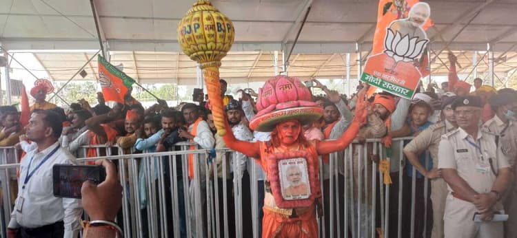 मुंगेर. प्रधानमंत्री नरेंद्र मोदी की सभा में एक समर्थक भगवा रंग में रंगा वीर हनुमान के वेष में पहुंचा तो लोगों ने जय श्रीराम, वीर हनुमान के नारे लगाने लगे. पूरी सभा में वह एक आकर्षण का केंद्र बिंदु बन गया. हनुमान के वेष में पहुंचा समर्थक भगवा रंग से रखा हुआ था. इसने एक हाथ में गदा तो सिर पर कमल का बड़ा सा मुकुट पहन रखा था, जबकि सीने पर पीएम नरेंद्र मोदी की फोटो टांग रखा था. युवक ने बताया कि वह बेगूसराय का रहने वाला है और उसका नाम श्रवण कुमार साह है. अब तक बिहार ही नहीं बिहार के बाहर भी वह इसी वेष में पीएम के कई सभाओं में भाग ले चुका है. उसने बताया कि वह पीएम नरेंद्र मोदी का फैन है. पीएम को श्री राम रूपी अपना भगवान मानता है. वो पीएम की रैली में इस रूप में शामिल हुआ है. जहां-जहां प्रधानमंत्री की रैली होती है, वो वहां-वहां चला जाता है. पीएम मोदी देश की गरीब जनता को ऊपर उठाने का काम कर रहे हैं. सभा स्थल पर एक और जहां मीडिया वालों ने उसे कैमरे में कैद किया. वहीं लोग उनके साथ फोटो खिंचवाने को लेकर भी बेताब दिखे.डिस्क्लेमर: यह प्रभात खबर समाचार पत्र की ऑटोमेटेड न्यूज फीड है. इसे प्रभात खबर डॉट कॉम की टीम ने संपादित नहीं किया है