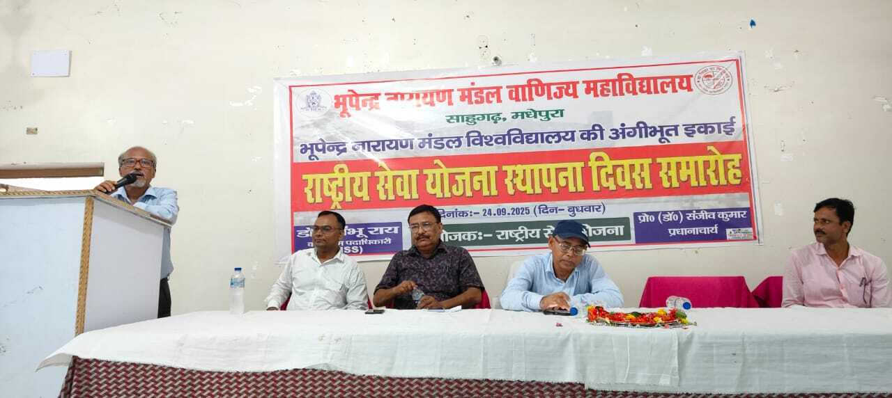 मधेपुरा. भूपेंद्र नारायण मंडल वाणिज्य महाविद्यालय में राष्ट्रीय सेवा योजना (एनएसएस) का ्स्थापना दिवस बुधवार को मनाया गया. कार्यक्रम ककी अध्यक्षता महाविद्यालय के प्रधानाचार्य प्रो डॉ संजीव कुमार ने की. एनएसएस पदाधिकारी शंभु रॉय, नोडल ऑफिसर डॉ सत्येंद्र कुमार और अर्थपाल डॉ. कमलेश कुमार ने अतिथियों का स्वागत किया. एनएसएस के संयोजक डॉ ब्रह्मानन्द ठाकुर ने संगठन की गतिविधियों और इसके उद्देश्यों पर प्रकाश डालते हुए छात्रों को सदैव सक्रिय भागीदारी के लिए प्रेरित किया. वहीं हिंदी विभाग की सहायक प्राध्यापक डॉ प्रियंका कुमारी ने एनएसएस के सामाजिक महत्व और सेवा भावना के आदर्श को रेखांकित किया. बोटनी विभाग के सहायक प्राध्यापक ऐश्वर्य कुमार ने विद्यार्थियों के सर्वांगीण विकास में एनएसएस की भूमिका को आवश्यक बताया. मैथिली विभाग के सहायक प्राध्यापक विनोद कुमार ने मातृभाषा में संक्षिप्त संबोधन देते हुए सेवा को जीवन की सबसे बड़ी साधना बताया. पीटीई प्रेम कुमार ने भी राष्ट्रीय सेवा योजना की विशेषताओं और समाज हित में इसके योगदान को समझाया. कार्यक्रम का मंच संचालन महाविद्यालय के जूलॉजी विभाग के सहायक प्राध्यापक तथा अर्थपाल डॉ कमलेश कुमार ने किया. मौके पर शिक्षक संघ के अध्यक्ष डॉ कमलेश कुमार, उर्दू विभाग के सहायक प्राध्यापक डॉ निजामुद्दीन अहमद, हिंदी विभाग की सहायक प्राध्यापक डॉ शेफालिका शेखर, डॉ प्रियंका कुमारी, समाजशास्त्र विभाग की सहायक प्राध्यापक डॉ अनामिका, मनोविज्ञान विभाग की सहायक प्राध्यापक डॉ अर्चना सहाय, मैथिली विभाग के सहायक प्राध्यापक डॉ दिवाकर कुमार, इतिहास विभाग के सहायक प्राध्यापक डॉ प्रभाकर कुमार आदि मौजूद थें. प्रधानाचार्य ने एनएसएस दिवस के ऐतिहासिक महत्व को प्रस्तुत किया.