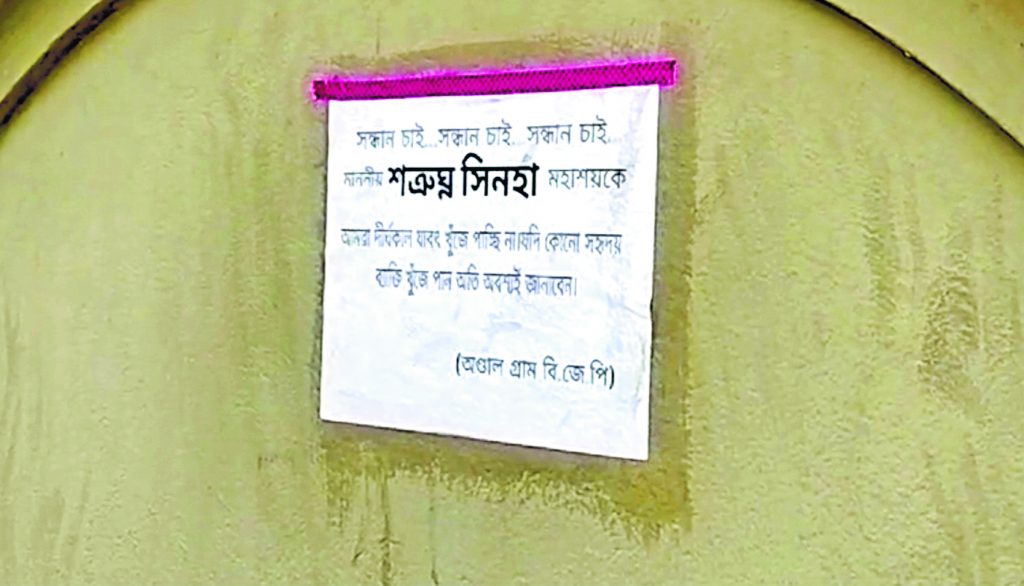 अंडाल में शत्रुघ्न सिन्हा के लापता होने का पोस्टर