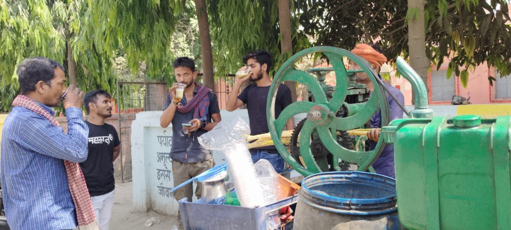 फोटो-15कैप्सन-प्यास बुझाने के लिए गन्ने का रस पीते राहगीर.——-