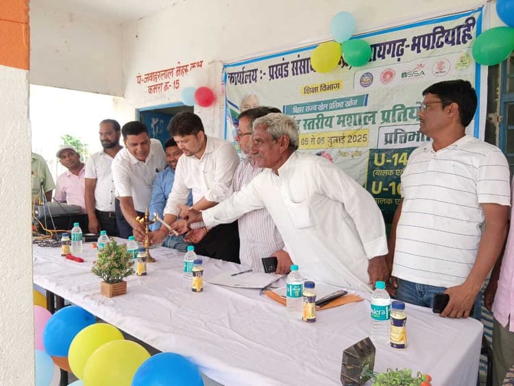 – बीडीओ व सीओ ने संयुक्त रूप से किया उद्घाटन, 12 संकुलों के छात्र-छात्राओं ने लिया भाग फोटो – 11 कैप्सन – दीप प्रज्जवलित कर कार्यक्रम का शुभारंभ करते विधायक सरायगढ़ बिहारी गुरमैता उच्च माध्यमिक विद्यालय, भपटियाही में सोमवार को प्रखंड स्तरीय मसाल कार्यक्रम के तहत खेलकूद प्रतियोगिता का भव्य आयोजन किया गया. इस कार्यक्रम का उद्घाटन बीडीओ अच्युतानंद, सीओ धीरज कुमार, प्रधानाध्यापक सुधीर कुमार यादव, डॉ उपेंद्र कुमार तथा शिक्षक सूर्यनारायण यादव ने संयुक्त रूप से दीप प्रज्वलित कर और फीता काटकर किया. इस खेलकूद प्रतियोगिता में प्रखंड के 12 संकुलों से चयनित छात्र-छात्राओं ने भाग लिया. प्रतियोगिता 14 वर्ष से कम एवं 16 वर्ष से कम आयु वर्ग में आयोजित की गई, जिसमें एथलेटिक्स और वॉलीबॉल प्रमुख खेल रहे. प्रतियोगिता के तहत 60 मीटर, 100 मीटर और 600 मीटर दौड़ की स्पर्धाएं कराई गईं. प्रतिभागियों ने जोश और उत्साह के साथ भाग लेकर अपने खेल कौशल का प्रदर्शन किया. प्रधानाध्यापक सुधीर कुमार यादव ने बताया कि खेलकूद कार्यक्रम के अगले चरण में मंगलवार को कबड्डी और साइक्लिंग की प्रतियोगिता आयोजित की जाएगी. उन्होंने कहा कि मसाल कार्यक्रम के माध्यम से छात्रों में खेलों के प्रति रुचि बढ़ रही है, जो सर्वांगीण विकास के लिए अत्यंत जरूरी है. इस अवसर पर विद्यालय के शिक्षक सदानंद कुमार, बलराम कुमार, सुजीत कुमार, राजेंद्र साह, प्रमोद कुमार, वसुंधरा यादव, दिलीप कुमार, रामकृष्ण ठाकुर, मोहन पाठक, ब्रह्मानंद मंडल सहित कई शिक्षक-शिक्षिकाएं तथा बड़ी संख्या में छात्र-छात्राएं उपस्थित रहे.
