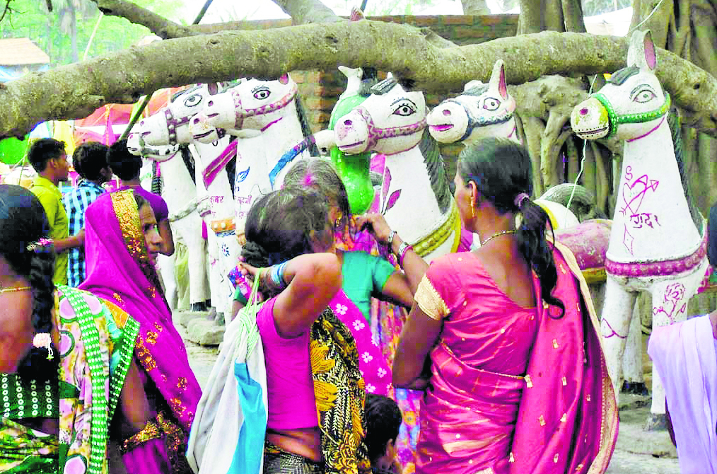 तरैया. प्रखंड की माधोपुर पंचायत के बनिया हसनपुर गांव में अमरनाथ बाबा के स्थान पर चैत विजयादशमी को लगने वाले घोड़ा लुटावन-पुत्र पावन मेले में श्रद्धालुओं की भारी भीड़ उमड़ी. उक्त घनी बस्ती में स्थित अमरनाथ बाबा के स्थान पर 1978 इ. से मेला लगते आ रहा है. अमरनाथ बाबा के स्थान व विशाल चबूतरे की चारों तरफ श्रद्धालु भक्तों के द्वारा दर्जनों सीमेंटेट घोड़ाें के निर्माण कराये जा चुके हैं. उक्त स्थल पर श्रद्धालु भक्त सच्चे मन से मन्नत मांगते हैं. जब मन्नत पूरी होती है तो बाबा के साथ पर मिट्टी के घोड़े चढ़ाते है. वहीं कई श्रद्धालुओं के द्वारा मंदिर के अंदर बाबा के स्थान पर पीतल के घोड़े फिक्स कराये जा चुके हैं. मेला कमेटी के सदस्यों ने बताया कि पहले भक्त मुसाफिर सहनी के द्वारा बाबा के स्थान पर मिट्टी के बर्तन में बने खीर भोजन का उधियावन किया जाता है तथा प्रसाद बाबा के मंदिर में चढ़ाया जाता है. उसके बाद घोड़ा चढ़ाने व लूटने का सिलसिला शुरू होता है. मेला कमेटी के द्वारा मेले में मिट्टी के घोड़े के रेट 20 से 30 रुपये निर्धारित किया जाता है, ताकि बाहर से आने वाले श्रद्धालुओं को परेशानी न हो. मेला कमेटी के सदस्यों ने बताया कि लगभग साढ़े आठ हजार से अधिक मिट्टी के घोड़े श्रद्धालुओं ने खरीद कर बाबा के स्थान पर चढ़ाये. घोड़ा लूटकर लेकर जाने वाले श्रद्धालु उक्त मिट्टी के घोड़े को लाल कपड़े में सुरक्षित बांध कर रखते हैं जब मन्नत पूरी होती है तो पुनः मेले में आकर मिट्टी के घोड़े खरीद कर उसका जोड़ा लगाकर चढ़ाते हैं. दिन-प्रतिदिन मेले का स्वरूप बदलते जा रहा है. हजारों युवक-युवतियां नौकरी के लालसा में घोड़ा लूटने मेले में पहुंचे हुए थे. माधोपुर मुखिया सह जदयू नेता सुशील सिंह ने कहा कि मेले में सुरक्षा-व्यवस्था को लेकर पुलिस दलबल के साथ तैनात है. वहीं, मेला कमेटी के वॉलंटियर भी सुरक्षा व्यवस्था में लगे हुए थे. अन्य जिले से भी पहुंचे श्रद्धालु : घोड़ा लुटावन-पुत्र पावन मेले में सारण जिले के अलावा मुजफ्फरपुर, मोतिहारी, गोपालगंज जिले से अधिक संख्या में श्रद्धालुओं पहुंचे हुए थे. प्रखंड प्रमुख प्रतिनिधि धनवीर कुमार सिंह विक्कू ने बाबा के स्थान पर पूजा-अर्चना की तथा प्रखंड, जिला व प्रदेश की उन्नति व आपसी सौहार्द की कामना की. प्रखंड प्रतिनिधि श्री विक्कू ने कहा कि मेरा पंचायत समिति क्षेत्र होने के नाते अपने निजी कोष से विशाल चबूतरे का निर्माण किया गया है तथा उक्त स्थल पर अन्य जरूरी सुविधाएं व्यवस्थित की जायेंगी, ताकि श्रद्धालुओं को किसी तरह की परेशानी न हो.