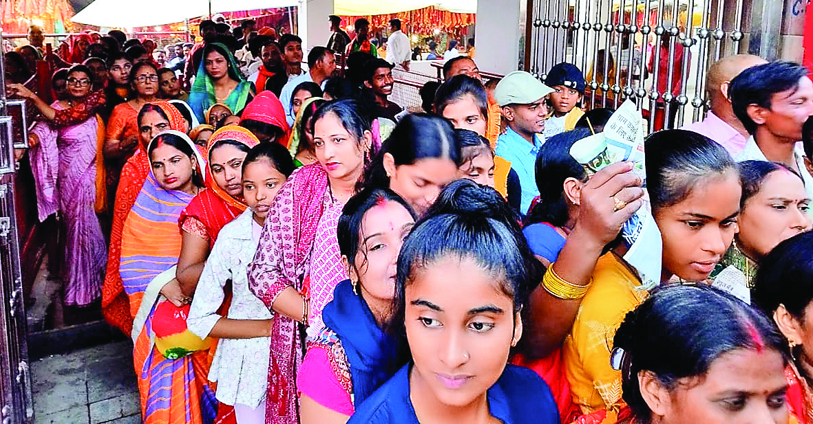 गोपालगंज. शारदीय नवरात्रि के तीसरे दिन बुधवार को मां सिंहासनी के दर्शन के लिए थावे में श्रद्धालुओं की भारी भीड़ उमड़ पड़ी. तड़के भोर से ही थावे की गलियां मां के जयकारों से गूंज उठीं. मां चंद्रघंटा के दिव्य स्वरूप का दर्शन कर भक्त भाव-विभोर हो उठे. भक्तों की कतारें मंदिर के बाहर लंबी दूरी तक लगी रहीं. लोग हाथों में नारियल, गुड़हल की माला और भोग प्रसाद लेकर माता के दरबार में पहुंचे. घंटों कतार में खड़े रहकर जब श्रद्धालु मां के दर्शन करते तो उनके चेहरे पर सुकून और श्रद्धा साफ झलकती थी. मंदिर परिसर में हर कोना आस्था से सराबोर था. भोर में जगत जननी की मंगला आरती के साथ शुरू हुआ दर्शन-पूजन का क्रम देर रात तक चलता रहा. प्रशासन द्वारा मां के गर्भगृह का मुख्य द्वार खोले जाने से दर्शन में काफी सहूलियत हुई. अब श्रद्धालुओं को बिना धक्का-मुक्की के आसानी से मां की मनोहारी छवि का दर्शन हो रहा है. मंदिर परिसर में साधक जगह-जगह बैठकर पूजा-पाठ और ध्यान में लीन दिखे. महिला श्रद्धालु मां को सिंदूर अर्पित कर कलाई पर रक्षा सूत्र बंधवाने की परंपरा निभा रही थीं. उधर, मंदिर के मुख्य पुजारी पं. संजय पांडेय ने बताया कि आज मां चंद्रघंटा की पूजा-अर्चना की गयी. यह स्वरूप भक्तों को आत्मबल, शांति और सुख-समृद्धि प्रदान करता है. मां के पूजन से घर में क्लेश दूर होता है और जीवन खुशियों से भर उठता है. नेपाल, उत्तर प्रदेश और बिहार के विभिन्न जिलों से आए श्रद्धालु नारियल, चुनरी और पेड़ा अर्पित कर मां से अपने मनोकामनाओं की पूर्ति की प्रार्थना कर रहे थे. मां सिंहासनी का दरबार भक्ति, श्रद्धा और आस्था से सराबोर रहा.