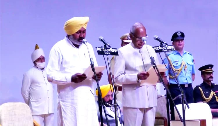 पंजाब की भगवंत मान कैबिनेट में मंत्री के तौर पर जिन लोगों को शपथ दिलाई गई है, उनमें हरपाल सिंह चीमा, हरभजन सिंह, डॉ विजय सिंगला, लाल चंद, गुरमीत सिंह मीत हेयर, कुलदीप सिंह धालीवाल, लालजीत सिंह भुल्लर, ब्रह्म शंकर जिम्पा, हरजोत सिंह बैंस और डॉ बलजीत कौर शामिल हैं. कैबिनेट में मुख्यमंत्री सहित 18 पद हैं. पंजाब के राज्यपाल बनवारी लाल पुरोहित ने स्वतंत्रता सेनानी भगत सिंह के पैतृक गांव खटकड़ कलां में बुधवार को भगवंत मान को मुख्यमंत्री पद की शपथ दिलाई थी.