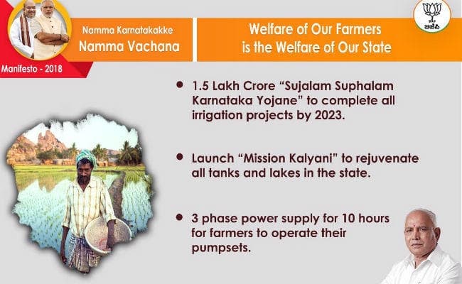 बेंगलुरु : भाजपा ने कर्नाटक विधानसभा चुनाव के लिए शुक्रवार को घोषणापत्र जारी किया. पार्टी ने प्रदेश में सरकार बनने के पर सिंचाई परियोजनाओं के मद में डेढ़ लाख करोड़ रुपये आवंटित करने और राष्ट्रीयकृत एवं सहकारी बैंकों से लिये गये एक लाख रुपये तक के कृषि ऋण माफ करने का वादा किया.
