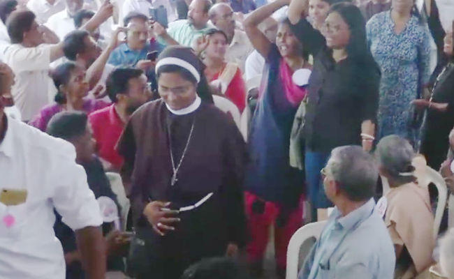 Kerala: Celebrations in Kochi following the arrest of rape accused Bishop #FrancoMulakkal. He has been sent to police custody till 24 September. His bail application has been dismissed. pic.twitter.com/n3VSv8pNqZ
