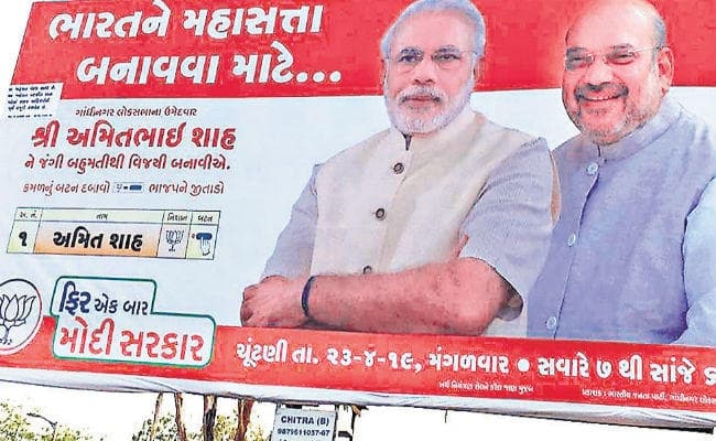 साथ खड़े कन्हैया लाल सहमति जताते हुए एक होर्डिंग की ओर इशारा करते हैं, जिस पर मोदी-शाह की फोटो है और लिखा है, ‘भारत को महाशक्ति बनाने के लिए अमित शाह को भारी मतों से जिताएं और मोदी को एक बार फिर से पीएम बनाएं.’