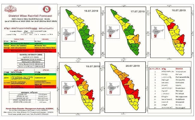 इडुक्की, मलप्पुरम, वायनाड, कन्नूर, एर्नाकुलम और त्रिशूर जिलों में 18-20 जुलाई के दौरान बेहद भारी वर्षा होने की संभावना है. भारतीय मौसम विभाग (आईएमडी) के एक बुलेटिन के अनुसार 24 घंटे में 204 मिलीमीटर से अधिक वर्षा होने का अनुमान है.