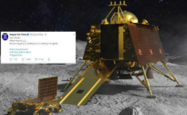 ‘विक्रम’ का शनिवार को चंद्रमा की सतह पर उतरने के दौरान उसकी सतह से 2.1 किलोमीटर दूर रहने के दौरान इसरो के मिशन कंट्रोल सेंटर से संपर्क टूट गया था. इसरो प्रमुख के सिवन ने रविवार को कहा था कि लैंडर विक्रम के साथ संपर्क स्थापित करने के प्रयास किये जा रहे हैं. नागपुर पुलिस ने अपने आधिकारिक ट्विटर हैंडल पर कहा, प्रिय विक्रम, कृपया जवाब दो. हम सिग्नल तोड़ने पर तुम्हारा चालान नहीं काटेंगे. सोशल मीडिया पर नागपुर पुलिस के इस ट्वीट को खूब पसंद किया जा रहा है और उसके हास्यबोध की भी तारीफ हो रही है. ट्वीट को कुछ ही घंटों के अंदर ही 31 हजार से ज्यादा यूजर्स ने लाइक किया और नौ हजार से ज्यादा लोगों ने इसे रीट्वीट किया.
