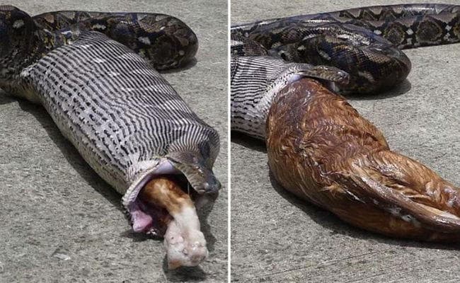 वड़ोदरा: गुजरात में वड़ोदरा जिले के एक मकान के पिछवाड़े नौ फुट के एक विशालकाय अजगर ने एक मोटी बिल्ली को निगल लिया लेकिन उसे पचाने में दिक्कत होने पर उसने उसे बाहर निकाल दिया.