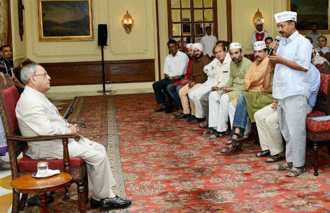 नयी दिल्ली: दिल्ली में सरकार गठन को लेकर आम आदमी पार्टी (आप) के संयोजक और पूर्व मुख्यमंत्री अरविंद केजरीवाल कल राष्ट्रपति से मिले. केजरीवाल अपने 22 विधायकों के साथ राष्ट्रपति प्रणब मुखर्जी से मिलने राष्ट्रपति भावन गये थे. केजरीवाल और उनके विधायकों ने राष्ट्रपति प्रणब मुखर्जी से गुहार लगाई कि वह उप-राज्यपाल नजीब जंग को दिल्ली में सरकार बनाने के लिए भाजपा को न्योता देने की इजाजत नहीं दें. पार्टी ने दिल्ली विधानसभा तुरंत भंग करने की भी मांग की.