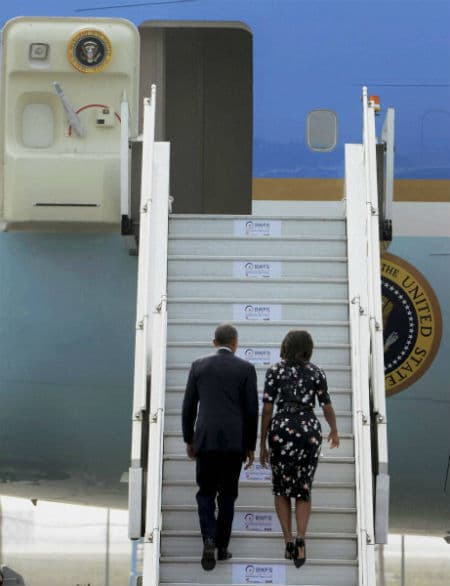 ओबामा के आधिकारिक विमान एयर फोर्स वन ने दिल्ली के पालम हवाई अड्डे से सऊदी अरब के रियाध के लिए उड़ान भरी. ओबामा वहां के पूर्व शासक शाह अब्दुल्लाह की मृत्यु होने की वजह से जा रहे हैं. शाह अब्दुल्लाह की 23 जनवरी को मृत्यु हो गयी थी और उसके बाद शाह सलमान इस समय सऊदी अरब का शासन सम्हाल रहे हैं.