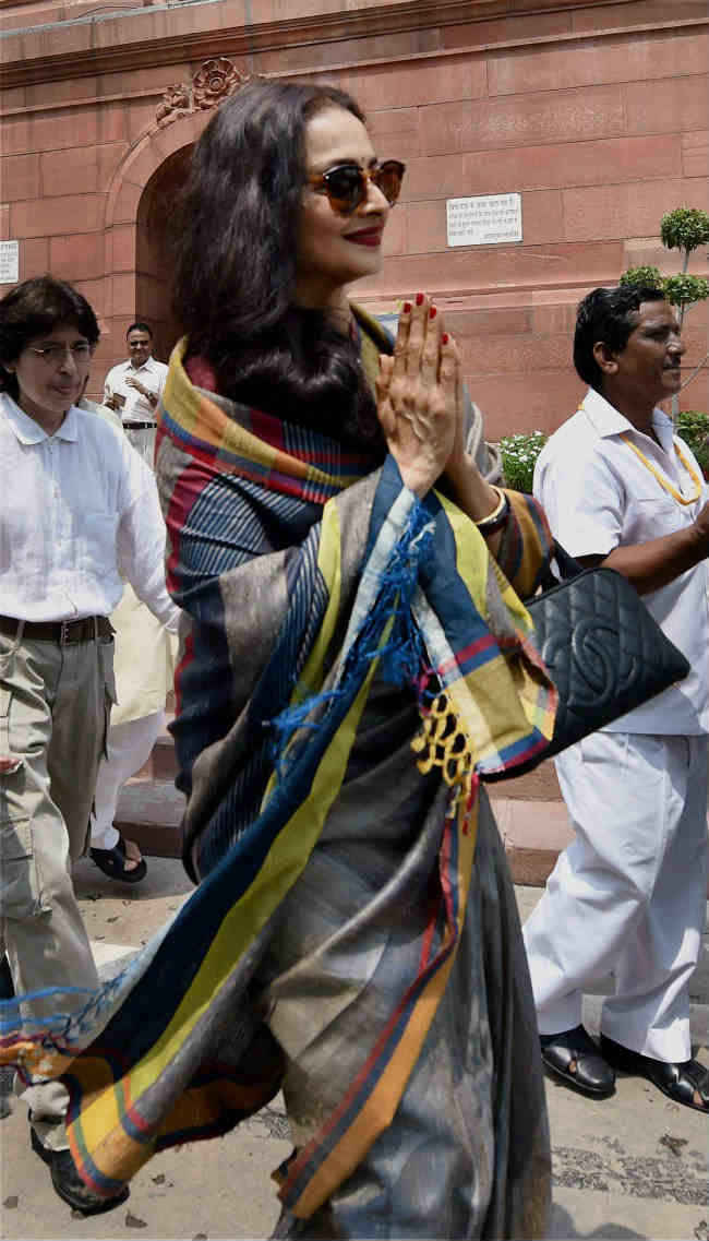 नयी दिल्ली : राज्यसभा सांसद और अपने जमाने की प्रसिद्ध अभिनेत्री रेखा आज संसद की कार्यवाही में हिस्सा लेने के लिए पहुंचीं. उन्होंने ग्रे कलर की साड़ी पहन रखी थी और अपने बालों को खुला रखा था. वे कुछ देर वहां रूकीं. रेखा ने वहां उपस्थित सांसदों का अभिवादन भी किया. वर्ष 2012 में रेखा को क्रिकेटर सचिन के साथ राज्यसभा का सांसद बनाया गया था. रेखा को अकसर राज्यसभा की कार्यवाही में शामिल होते देखा गया है.