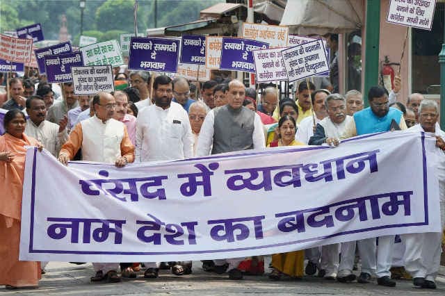 नयी दिल्ली : संसद का मॉनसून सत्र पूरी तरह से बर्बाद हो जाने के बाद अब भाजपा व कांग्रेस के बीच सदन की जगह सडक पर घमासान होगा. दिलचस्प यह कि भाजपा रणनीतिक ढंग से इस घमासान का केंद्र कांग्रेस व वामपंथी दलों की राजनीतिक जमीन को ही बनायेगी. भाजपा के मुख्य रणनीतिकार व वित्तमंत्री अरुण जेटली ने गुरुवार को संसद सत्र के अवसान के बाद प्रेस कान्फ्रेंस कर इसका एलान भी कर दिया. इस संग्राम में भाजपा मुख्य रूप से जीएसटी को कांग्रेस व वाम दलों की घेराबंदी के लिए हथियार बनायेगी. उल्लेखनीय है कि कांग्रेस के पास 44 व वाम दलों के पास नौ लोकसभा सीटें हैं.