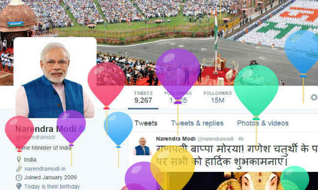 नयी दिल्ली : प्रधानमंत्री नरेंद्र मोदी का आज 65 वां जन्मदिन है. उनके बर्थडे पर जहां सूरत में 65 किलो का केक काटा गया वहीं सोशल नेटवर्किंग साइट ट्विटर ने उन्हें अपने अंदाज में जन्मदिन की बधाई दी है. ट्विटर ने पीएम मोदी का ट्विटर अकाउंट को ओनोखे अंदाज में सजाया है जिसमें उनके वॉल पर जाते ही गुब्बारे लहराने लगते हैं. ट्विटर ने एनिमेटेड रंग-बिरंगे गुब्बारे से प्रधानमंत्री के वॉल को सजाया है.
